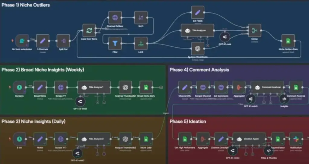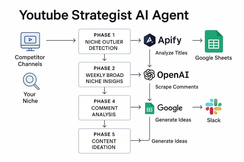 The YouTube Strategist AI Agent is an end-to-end content intelligence system designed to help creators grow their YouTube channels through smart automation. Built using n8n, OpenAI, Apify, and Google Sheets, it replicates the daily work of a content strategist—automating research, analysis, and ideation.